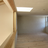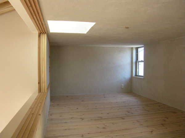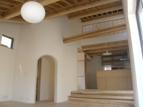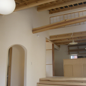 スキップ階段のあるLDKです。杉の素材を生かし壁には漆喰を使っています