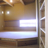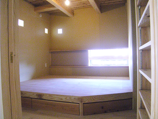 天井表しの寝室。作付けのベットの下には収納箱