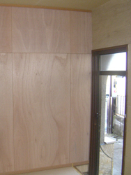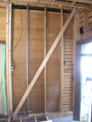 ![]() 壁を解体し、筋違い材を金属で固定。 |